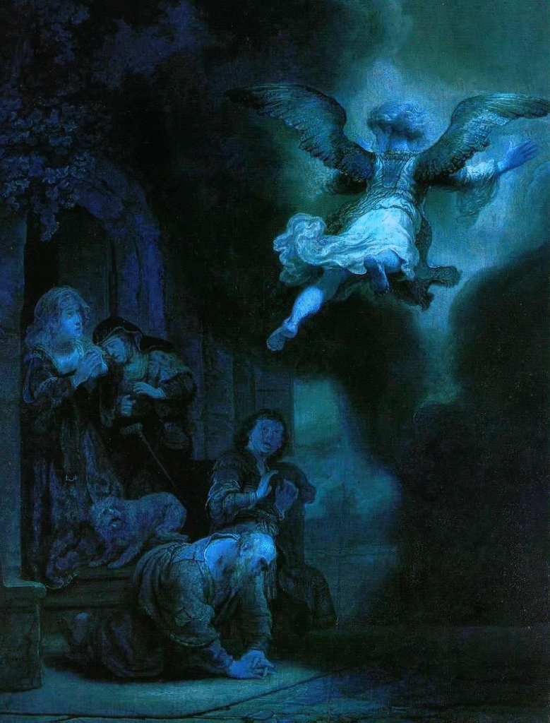 Figure 3. Rembrandt, The Archangel Raphael Leaving the Family of Tobit (1637). Public domain.